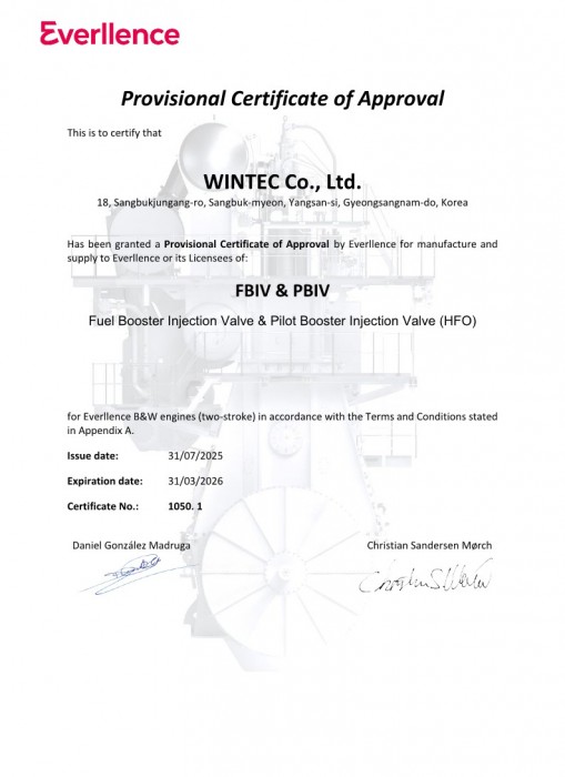 Fuel Booster Injection Valve & Pilot Booster Injection Valve (HFO) Provisional Certificate of Approval from Everllence 임시승인서